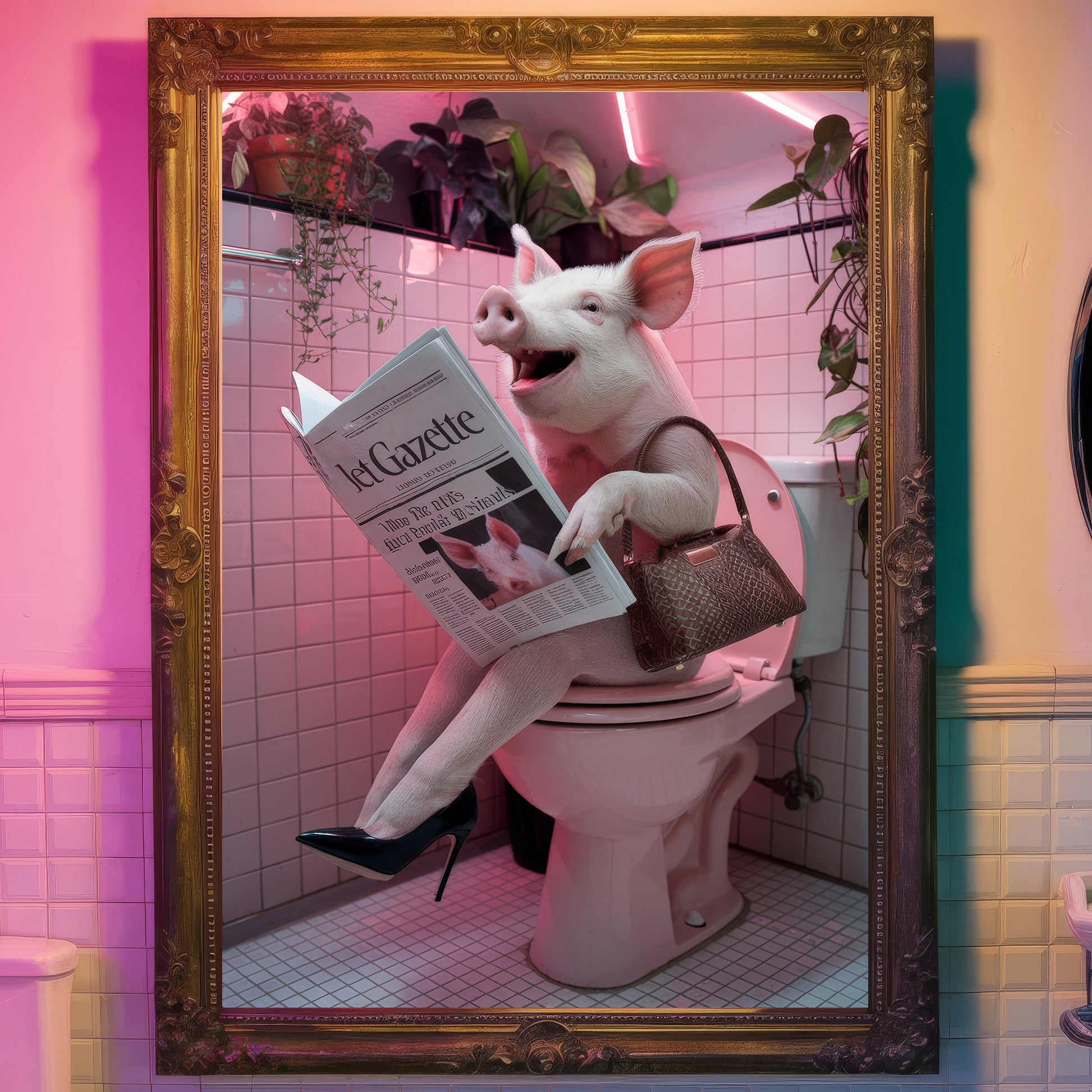 High heels, a designer handbag, and a front-page feature? This pig is living her best life! Sassy, stylish, and utterly charming, she turns an ordinary bathroom moment into a glamorous event. A fabulous addition to any space in need of a little flair and humor.