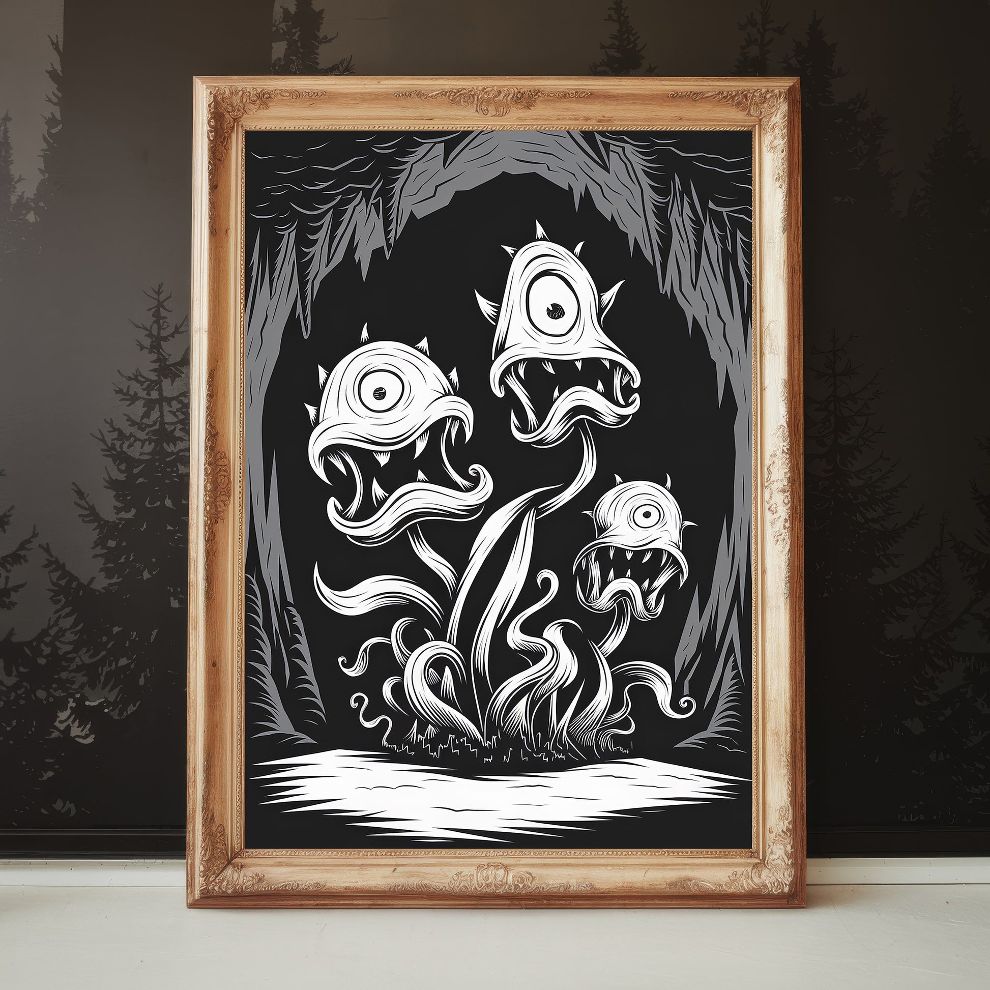 This striking black-and-white artwork showcases eerie, carnivorous mushrooms with monstrous, cyclopean eyes and razor-sharp teeth emerging from a dark cave. With twisted tendrils and haunting expressions, these fungi create a sinister, otherworldly atmosphere perfect for gothic or horror-themed decor.