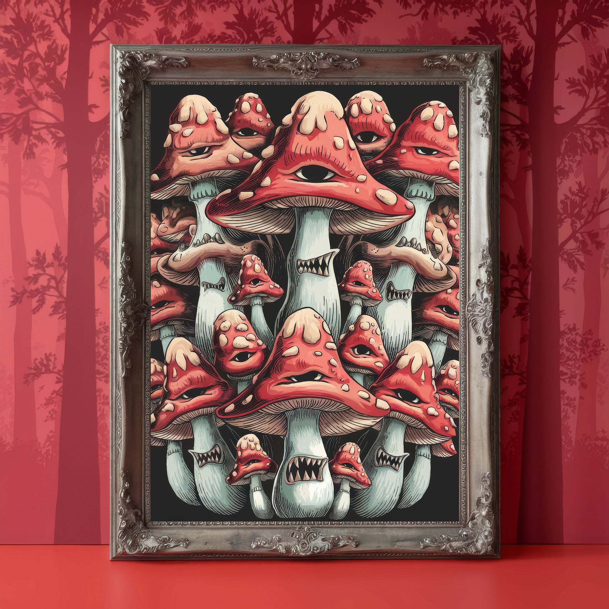"Eyes of the Enchanted Grove" – Surreal Red Mushroom Horror Art Print