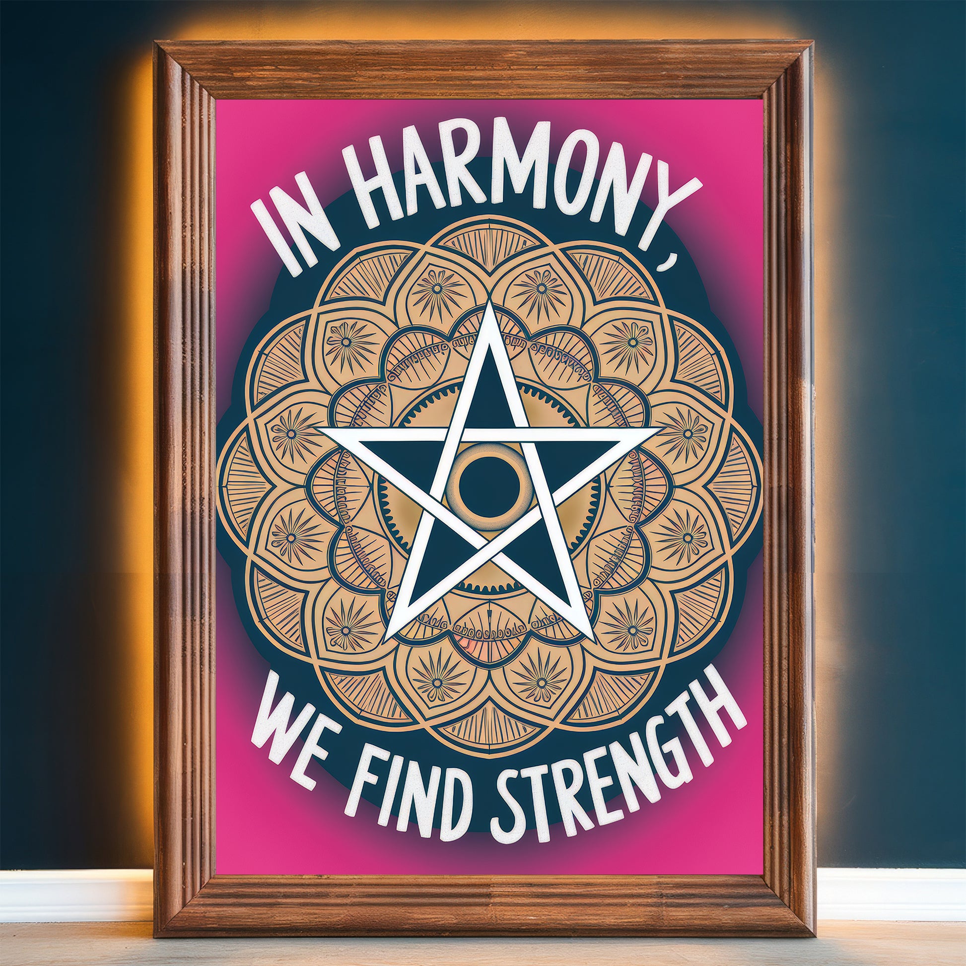 Pentagram Mandala 7 Wall Art Poster Print With Circled Affirmation Text "In Harmony, We Find Strength."
