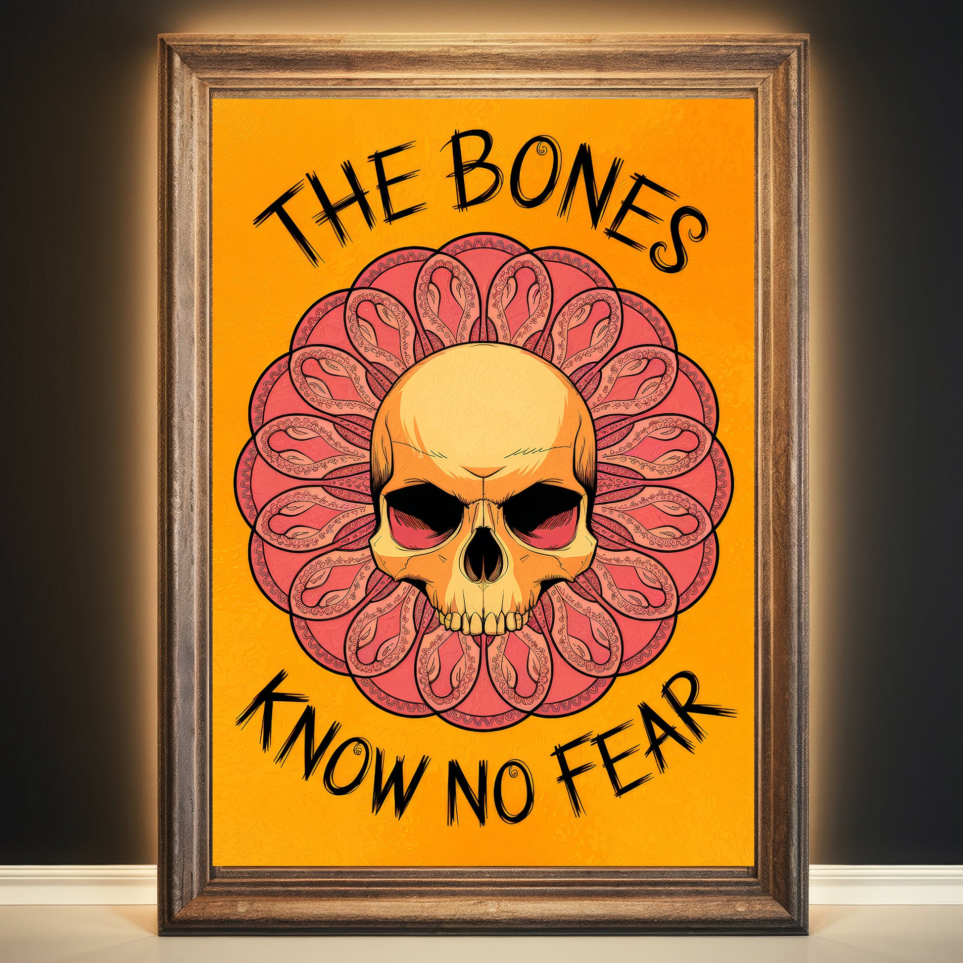 The Skull Mandala Wall Art Poster Print is a bold and intense piece, featuring a striking central skull surrounded by a rich mandala pattern in shades of red and pink. The warm golden-orange background adds contrast, while the hand-drawn text, "The Bones Know No Fear," highlights themes of strength and resilience. A powerful addition to any space.