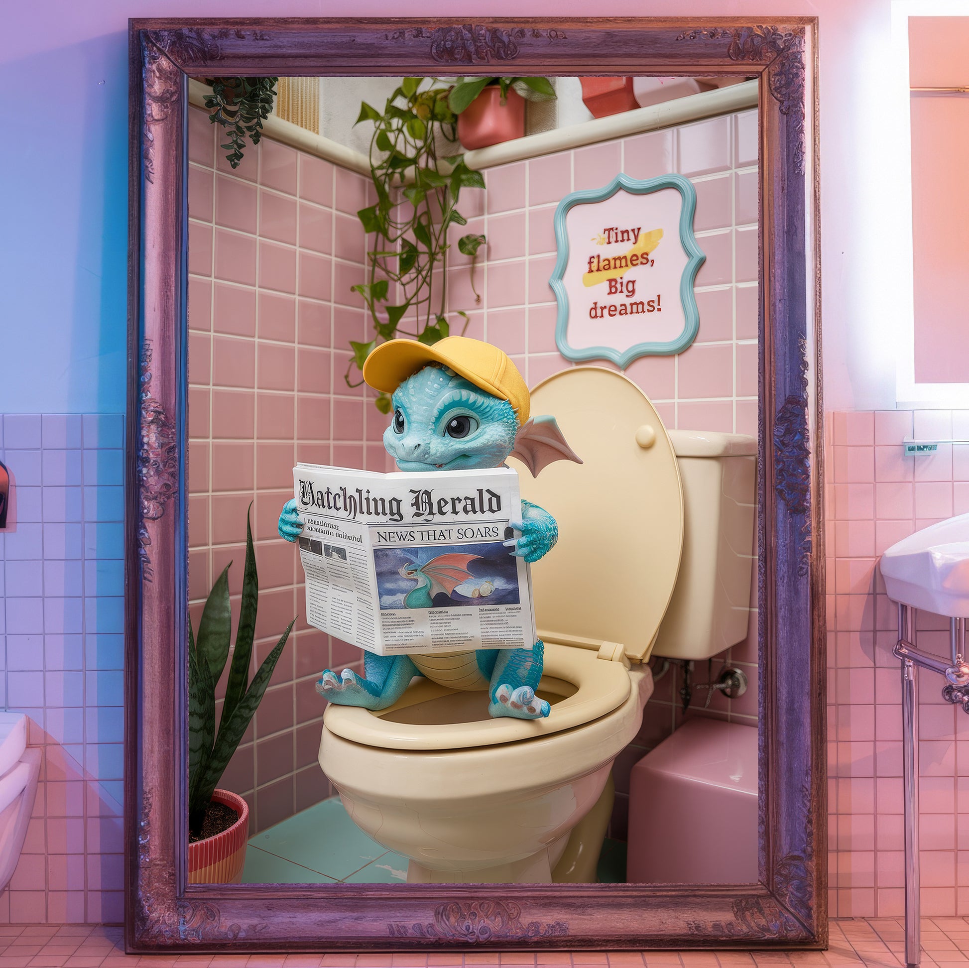 🔥 Tiny flames, big dreams! This sky-blue baby dragon is lost in thought, pondering great adventures while catching up on News That Soars. Dressed in a bright yellow cap and perched on a soft cream toilet in a charming pink-tiled bathroom, this little daydreamer brings a fun and cozy vibe to any space.